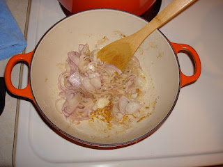 In the same pot goes the shallots. Shallots, the love-child of garlic and onion, cooked in turkey fat and juices = the wonderful smell of Thanksgiving.