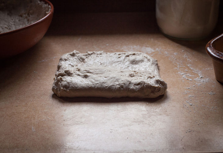 Shape dough into an 8x12 rectangle. Fold third of dough into the center, followed by the other third.